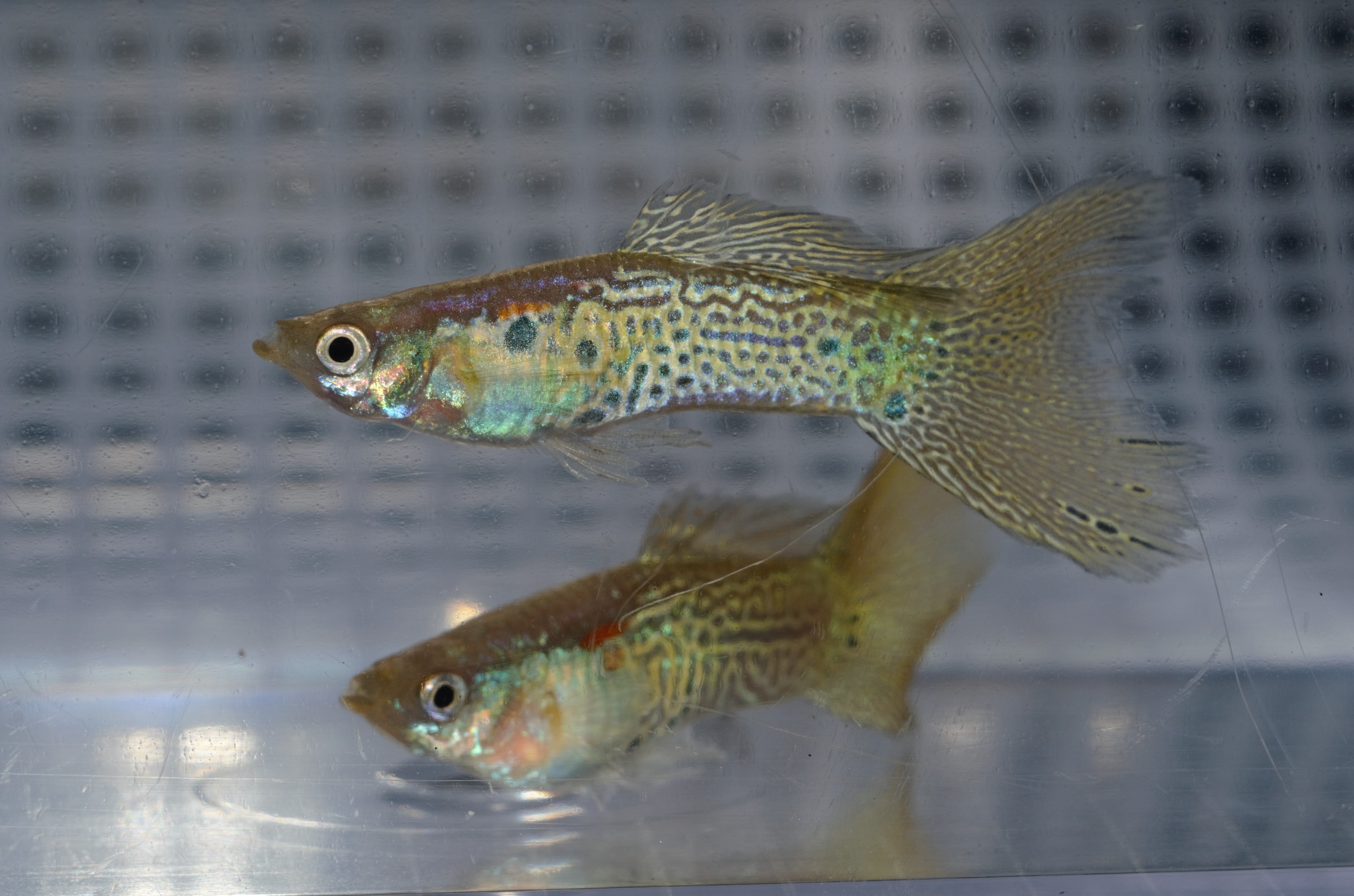 Jedan od moji mnogi projekata/ukrstanja. Koristio sam zelenog sarolikog muzijaka zmijske koze sa polu crnim leopard zenkama (bijele/pastelne, menta zelene i lavanda ljubicaste). Cilj mi je bio dobiti sto ljepse polu crne dvobojne. E sada cemo se dotaci i malo gupi-genetike. Polu crna boja tijela je dominantna i prenose je zenke. U vecini slucajeva ovo je tacno, ali … Kao sto mozemo dobiti ‘blans’ ili ‘albino’ od polu crni tako mozemo dobiti i druge boje. Ne samo od polu crni, ovo vazi za sve vrste i boje. U clanku koji sam napisao na engleskom jeziku ‘Moscow Guppies – Theory & Practice – Moscow Grass‘ mozete vidjeti da sam od Moskovskog muzijaka i plave travaste/tackaste zenke dobio samo jednog ‘vidnog’ hibrida, ostale su bili kopije muzijaka ili zenke. Bas zbog ovoga (sakriveni osobina/gena), pri nabavci gupika je vazno da nabavljate ribe od odgajivaca kojima mozete vijerovati. Sto znaci da od ‘na izgled cisti’ plavi travasti/tackasti’ u jednoj od narednih generacija pojavice se pokoji ‘na izgled cisti Moskovac’ i pokoji hibrid.