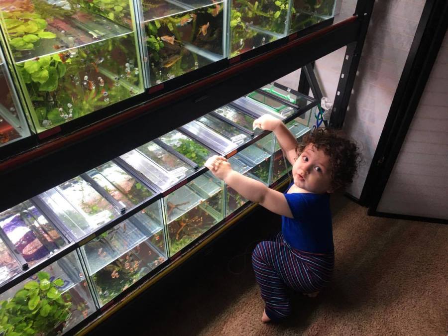 The youngest family member pretends to clean the tanks