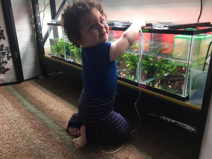 The youngest family member pretends to clean the tanks